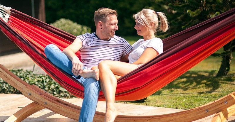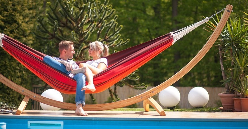 El soporte para hamacas Troya, realizado cuidadosamentea mano y en pino tratado para resistir las inclemencias del tiempo.