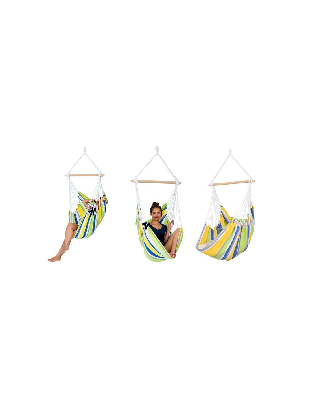 La hamaca silla Relax se despliega utilizando una barra de madera de haya de 85 cm de largo, nos aporta un sitio para soñar: con 1 m de ancho y 1,3 m.de largo.