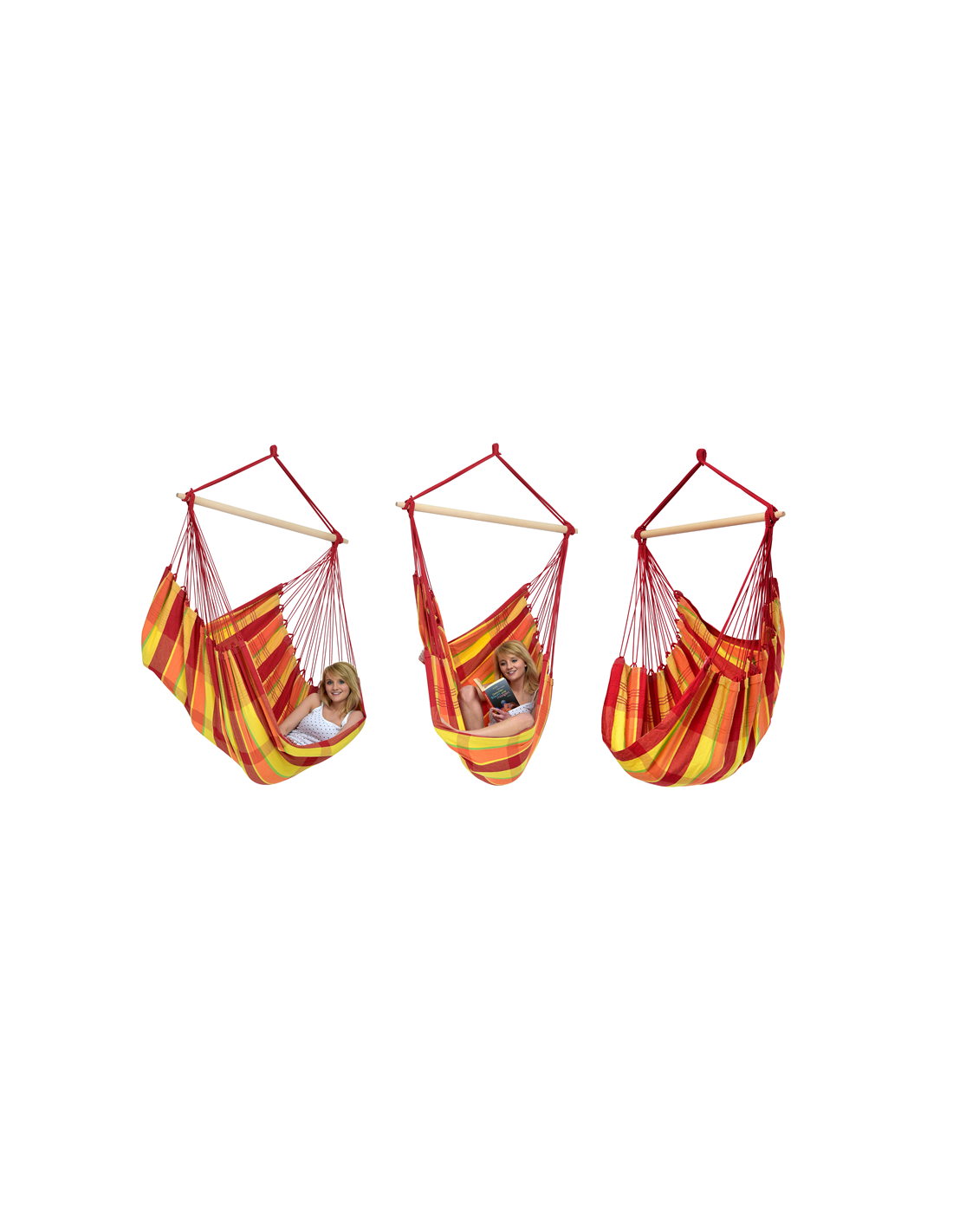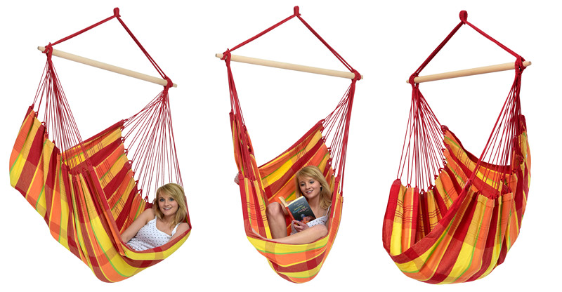 Hamaca silla Brasil, es la campeona del mundo de la siesta, nos aporta un sitio para soñar: con 1,30 m de ancho y 1,60 de largo, la hamaca Brasil tiene un tamaño extragrande. Disponible en varios colores: Natura, Moca, Papaya, Granada y Arco Iris