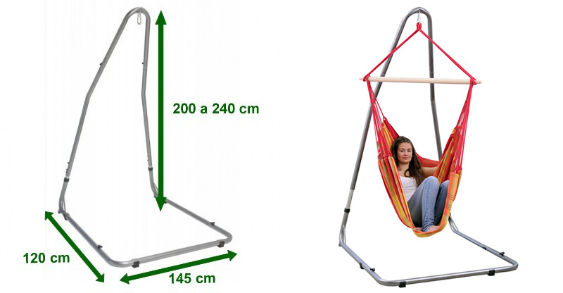 El soporte de silla hamaca Luna RockStone es el complemento ideal de tu hamaca silla, su altura regulable entre 200 y 240 cm. Ocupa muy poco espacio y se puede trasladar de un lugar a otro de la casa , la terraza o el jardín.