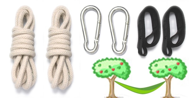 Con el Set Rápido Árbol se dispone de todo lo necesario para colgar nuestra hamaca en el jardín, una vez colocadas las eslingas en cada árbol sólo tenemos que ajustar la tensión -curvatura- de la hamaca a nuestro gusto y con un clic del mosquetón la ponemos o la guardamos en un momento.