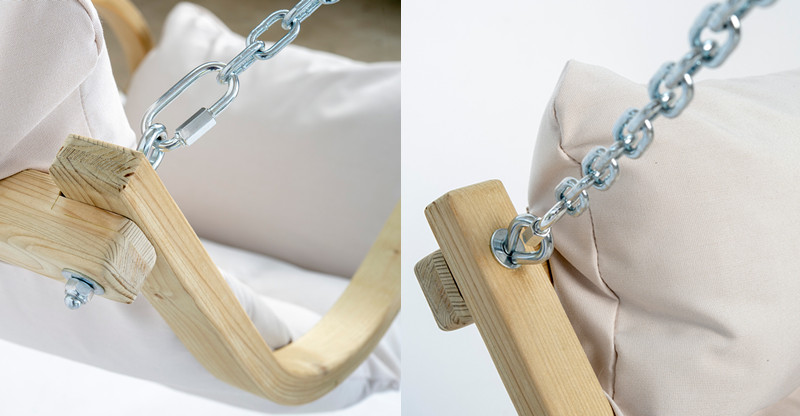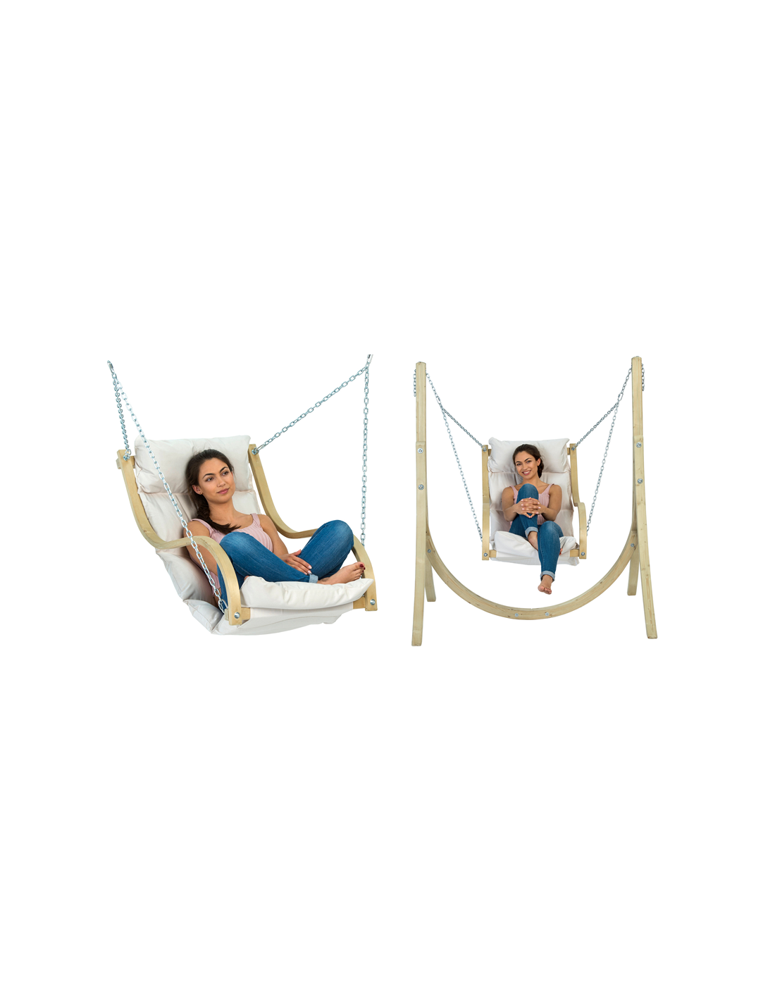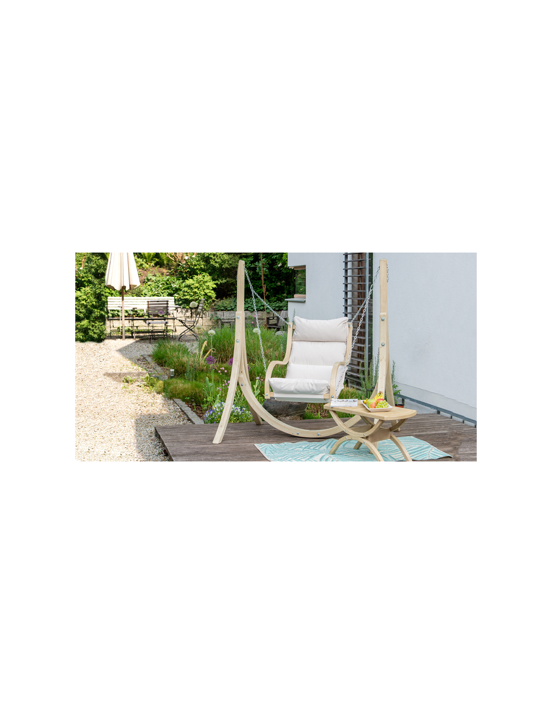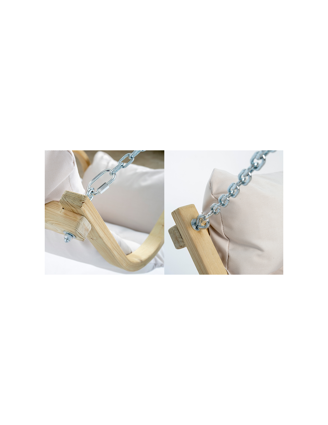 Está fabricada a mano en madera de abeto muy resistente a la intemperie. La laminación de alta calidad proporciona la máxima estabilidad y seguridad. El colchón extra grueso, repelente al agua y de secado rápido adicional es la garantía de una relajación perfecta.