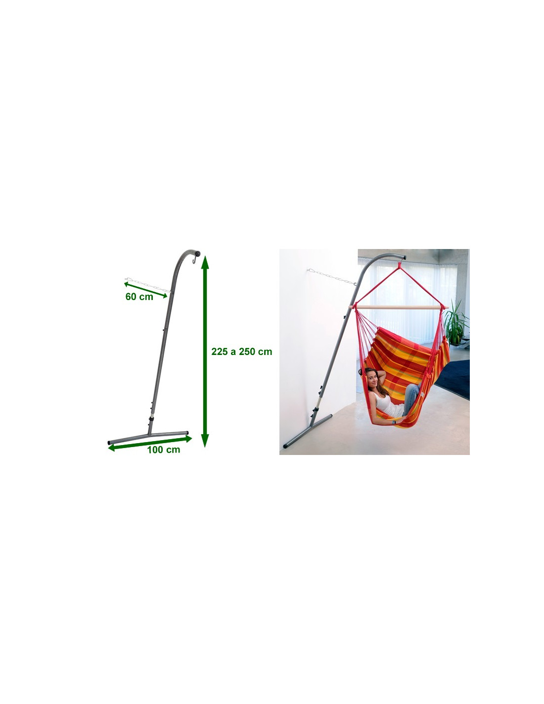 El soporte de silla hamaca Palmera RS es el complemento ideal de tu hamaca silla su altura regulable entre 225 y 250 cm. permite ajustar la altura de la silla hamaca al suelo según tus preferencias, es muy robusto, ocupa muy poco espacio y se puede colocar en el lugar preferido dentro de la casa, la terraza o el jardín.